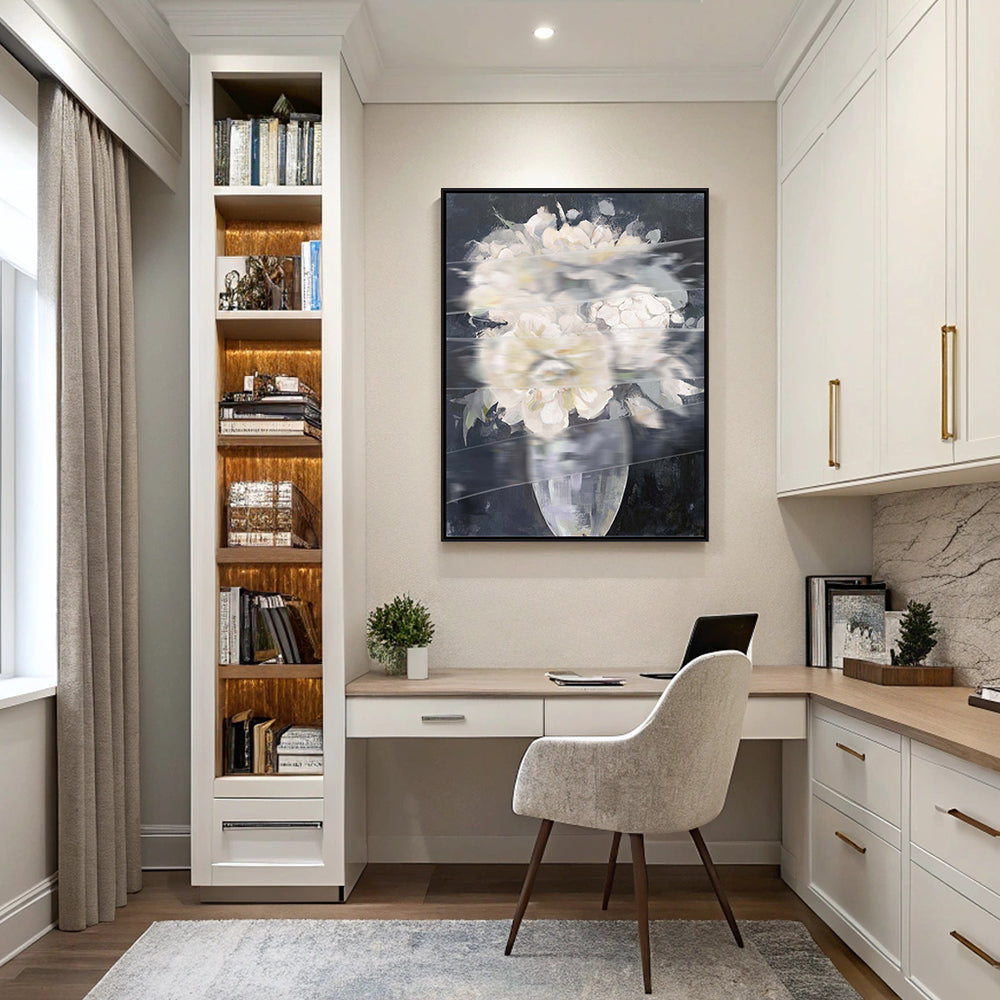 This artwork would enhance contemporary, minimalist, or modern interior design schemes. It suits spaces where sophisticated neutral tones are desired, such as in a living room, office, or bedroom. The abstract floral theme makes it particularly suitable for spaces where natural elements are appreciated but realistic representations might feel out of place.