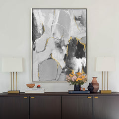 The white, black and grey predominate in this abstract painting, and the edges are adorned with gold leaf. It is beyond a decor piece; it's a work of art because handcrafted quality and organic geometry add sophistication and originality to the space.