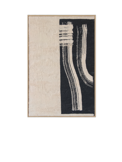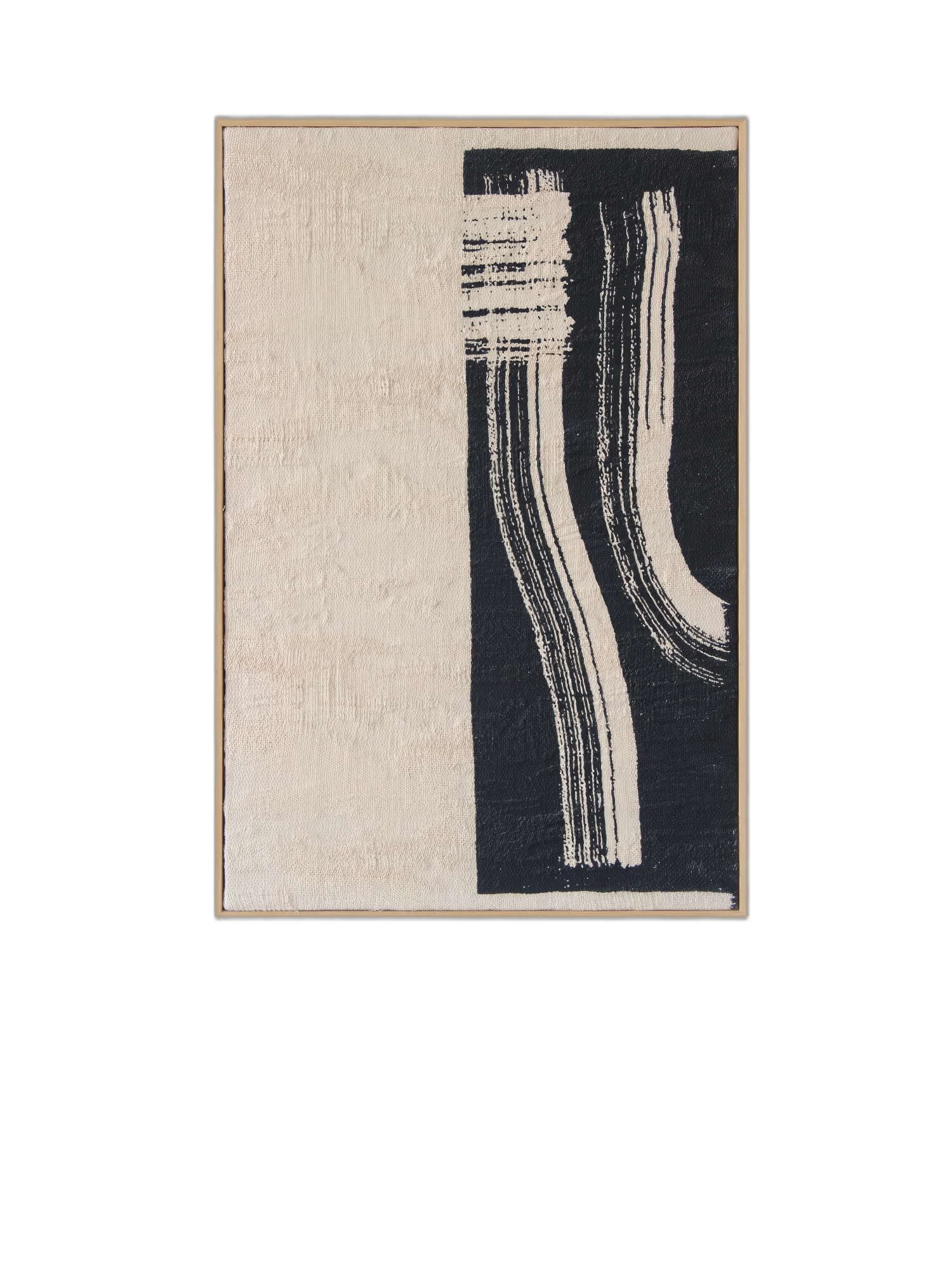 Design: High-contrast colors of beige and black are used with textured swaths in an energetic abstract composition. It is a very graceful version made in a modern ethos.