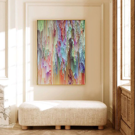 Perfectly suitable as a statement piece in living rooms, bedrooms, or offices, this Bold And Bright Color Cotton Thread Painting an elongated vertical design ideal for narrow wall spaces. It adds height and drama to your décor.
