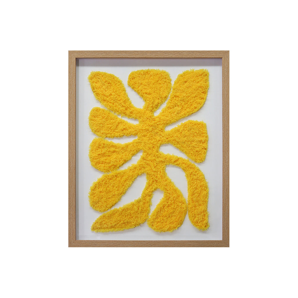 The core of this piece is in the shape of leaves in an exciting bright yellow. The material is made of coral velvet to make people feel warm, adding warmth and temperature to the room in winter. The base cloth is pure white linen, which highlights the color of several pieces of coral velvet. The surface texture is richly varied; it gives a feel from smooth to tufted in different sections. Overall, this wall art exudes the feel of something very contemporary and artistic to any interior space.