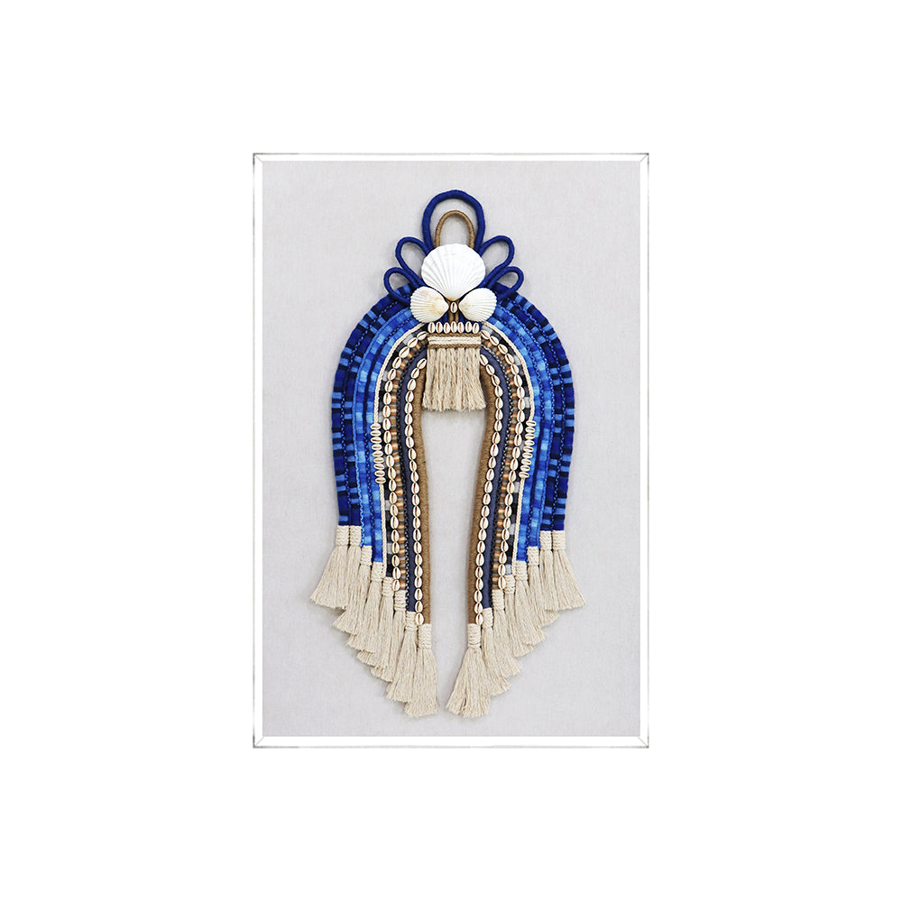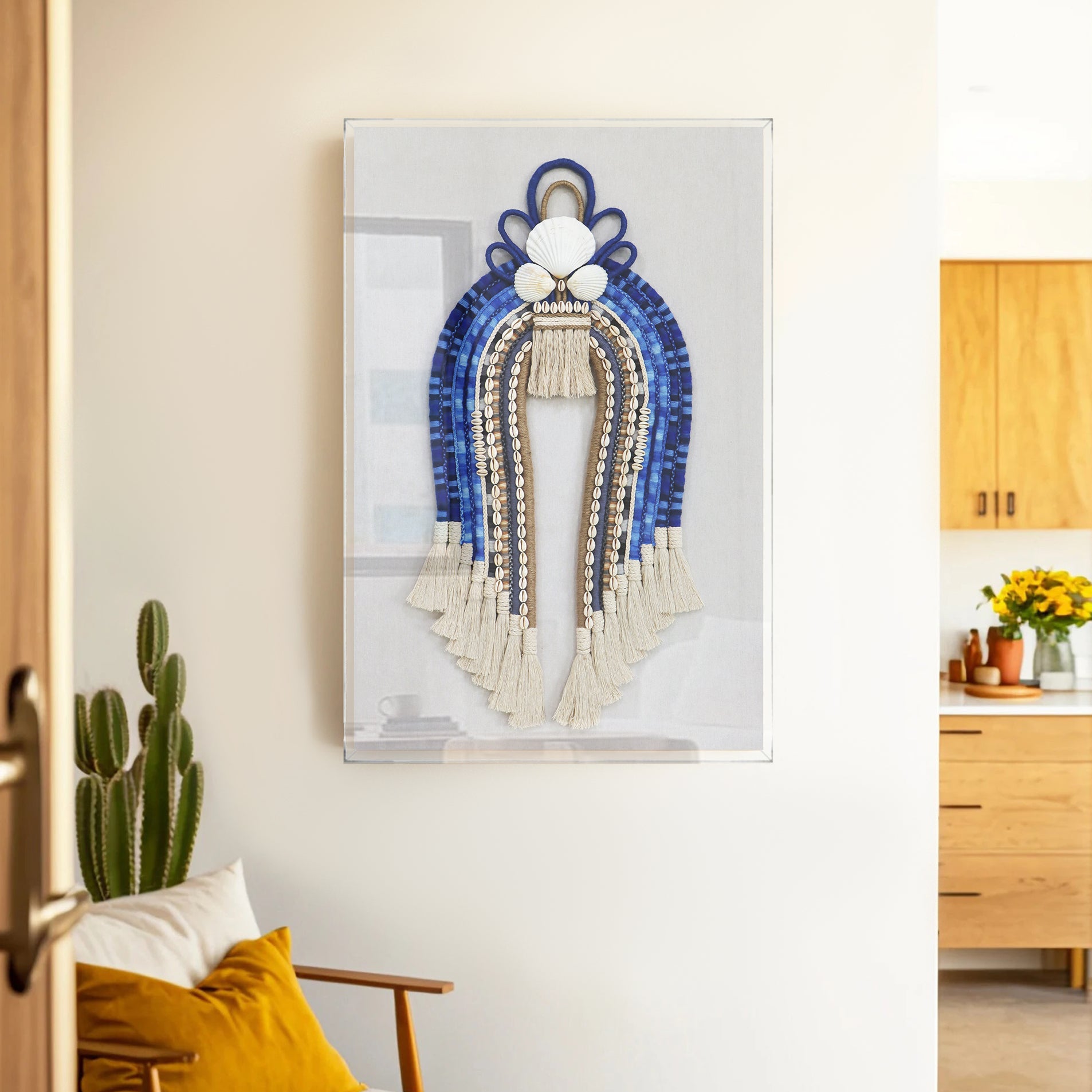 If you're looking for a unique piece of decoration that can add a textured style to your space, you can't go wrong with these woven shadow boxes, which help create a warm and cozy space. The round core is decorated with Bohemian style tassels and natural seashells, with hand-woven knots in blue and beige. The background is a textured light beige linen that enhances the texture of the painting. Create a relaxed and comfortable atmosphere.