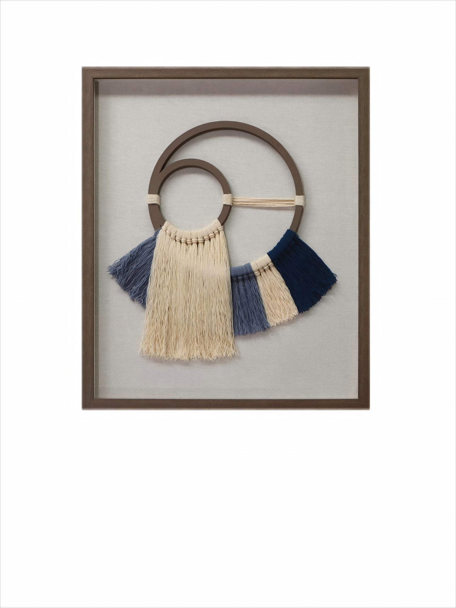 If you're looking for a unique decorative piece that will add texture style to your space, you can't go wrong with these macrame shadow-boxes,which helps make a warm and cozy space.The round core is embellished with Bohemian style fringe,matched with blue and white color fringe. The backing is a textured light beige linen that enhances the texture of the painting. Give a relaxed and comfortable atmosphere.