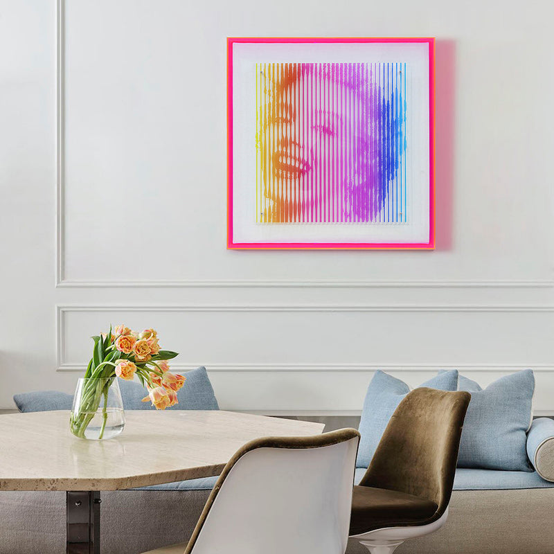 Bring on the forever glamorous legend Marilyn Monroe Multicolor Pop Art Wall Art. Monroe's iconic portrait immortalized in raucous rainbow colors, layered with acrylic insert to be very dynamic, very contemporary, purely electric pink. It would make a strong statement piece in virtually any space, beautifully bordered by neon pink acrylic.