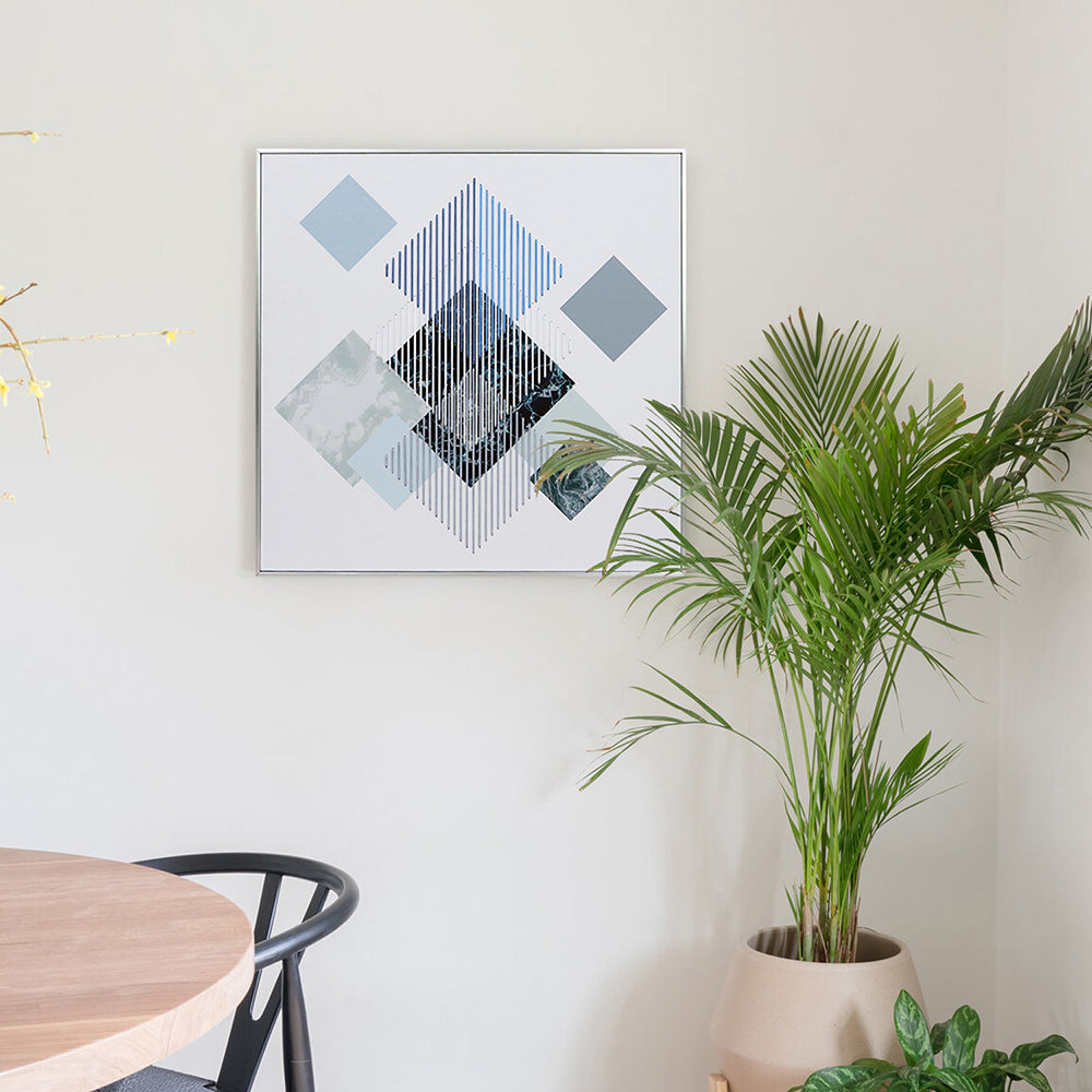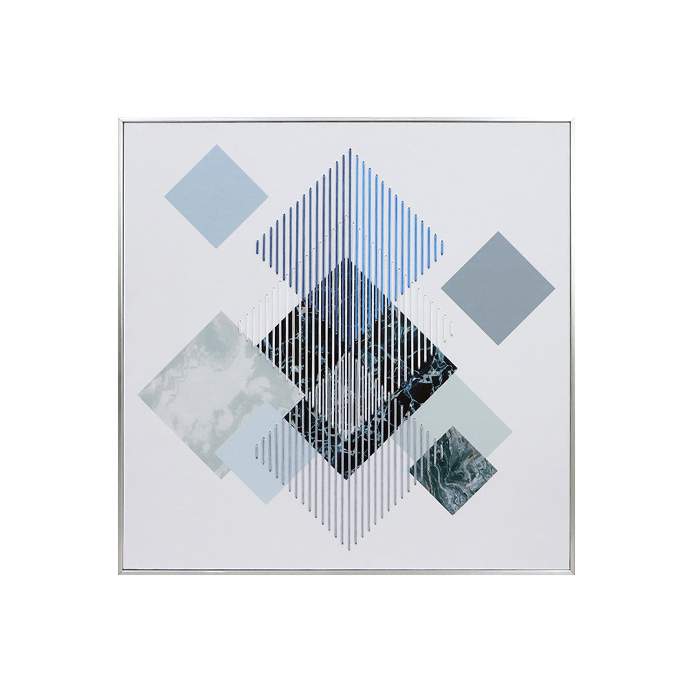 This wall art combines modern geometric design with 3D cotton lines. Made of high-quality materials, the work features multi-colored geometric patterns interspersed with 3D cotton lines. The theme is a 3D hanging picture created by multiple geometric figures. It has a smooth surface texture that exudes a very modern feel and aspect. It soothes and reflects quite a bit of modern interior sophistication.