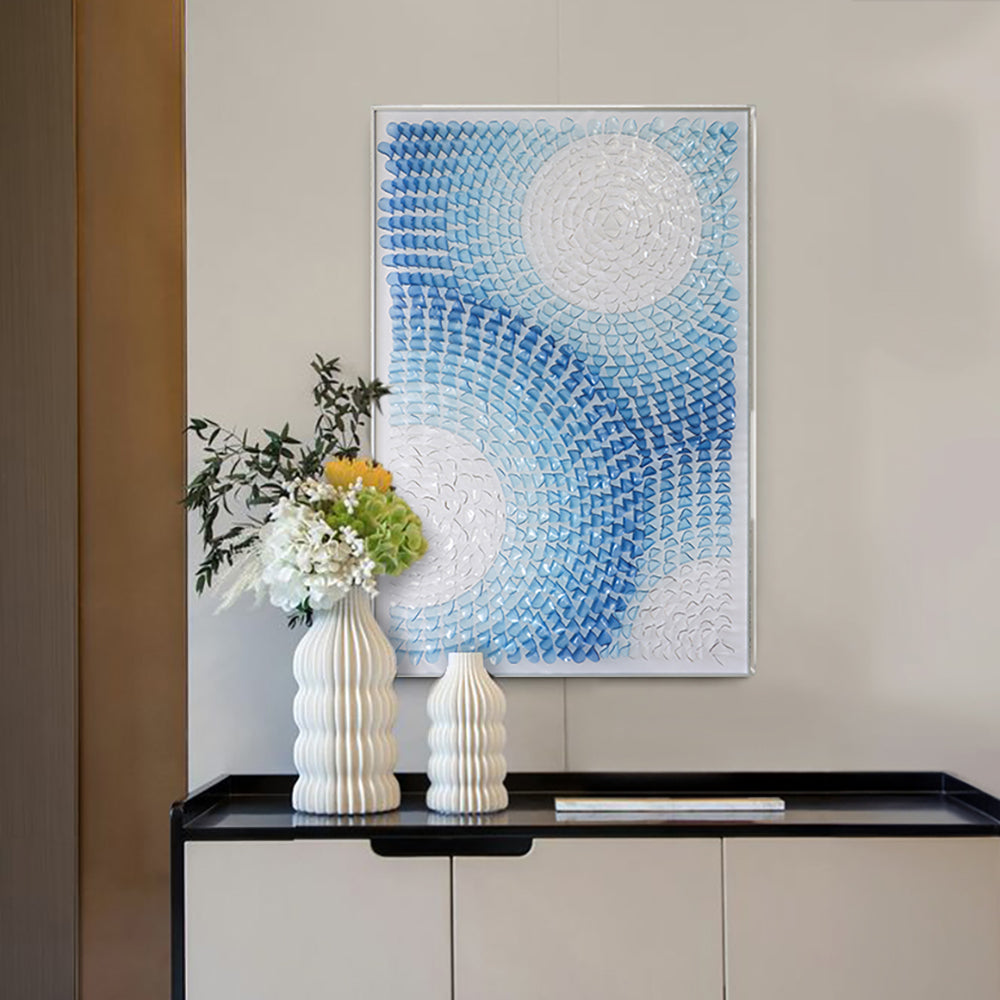 Touch every aspect of your world in the softest possible way with the Radiant Blue Waves Acrylic Wall Art. This beautiful, rich, multi-hued blue and white wall ornament has a delicate wave-like design, which promises to evoke movement and tranquil stillness. High gloss, textured, and reflective acrylic gives depth and dimension by creating light within an area.
