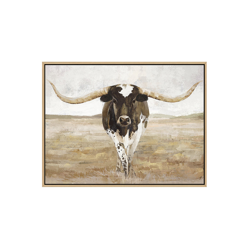 This hand-painted masterpiece showcases exceptional artistic craftsmanship, blending rustic elements with impressionistic techniques. The textured surface reveals visible brushstrokes that add depth and dimension, creating visual interest that changes with lighting conditions. The earthy color palette features warm browns, creamy whites, and subtle grays that harmonize beautifully while maintaining a natural aesthetic. The central subject, a majestic longhorn bull, is rendered with striking realism against a softly blended background that suggests an open plain. The canvas is gallery-wrapped and stretched on a sturdy wooden frame, ready to hang immediately.