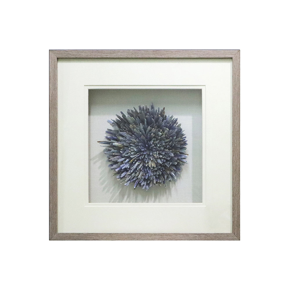 Being fabricated from actual ore material, the centerpiece bears dynamic texturing and natural luster. Soft blue coloration combined with its three-dimensional aspect really creates a soothing yet bold statement piece-elegant addition to any room, for sure. The shadow-box style frame just enhances it further; this really does look like it came from a gallery.
