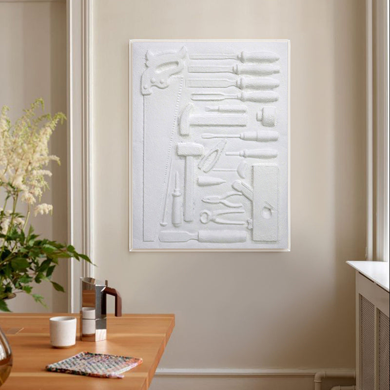 Perhaps the most striking aspect about this wall art is the industrial-meets-minimalist quality it offers. Referring to the incredible detailing of tools which permeate it with depth and value, besides giving it an elegant look with its monochromatic white design that stands out as a great achievement for versatile use, be it decorating a workshop, office, or contemporary living space.