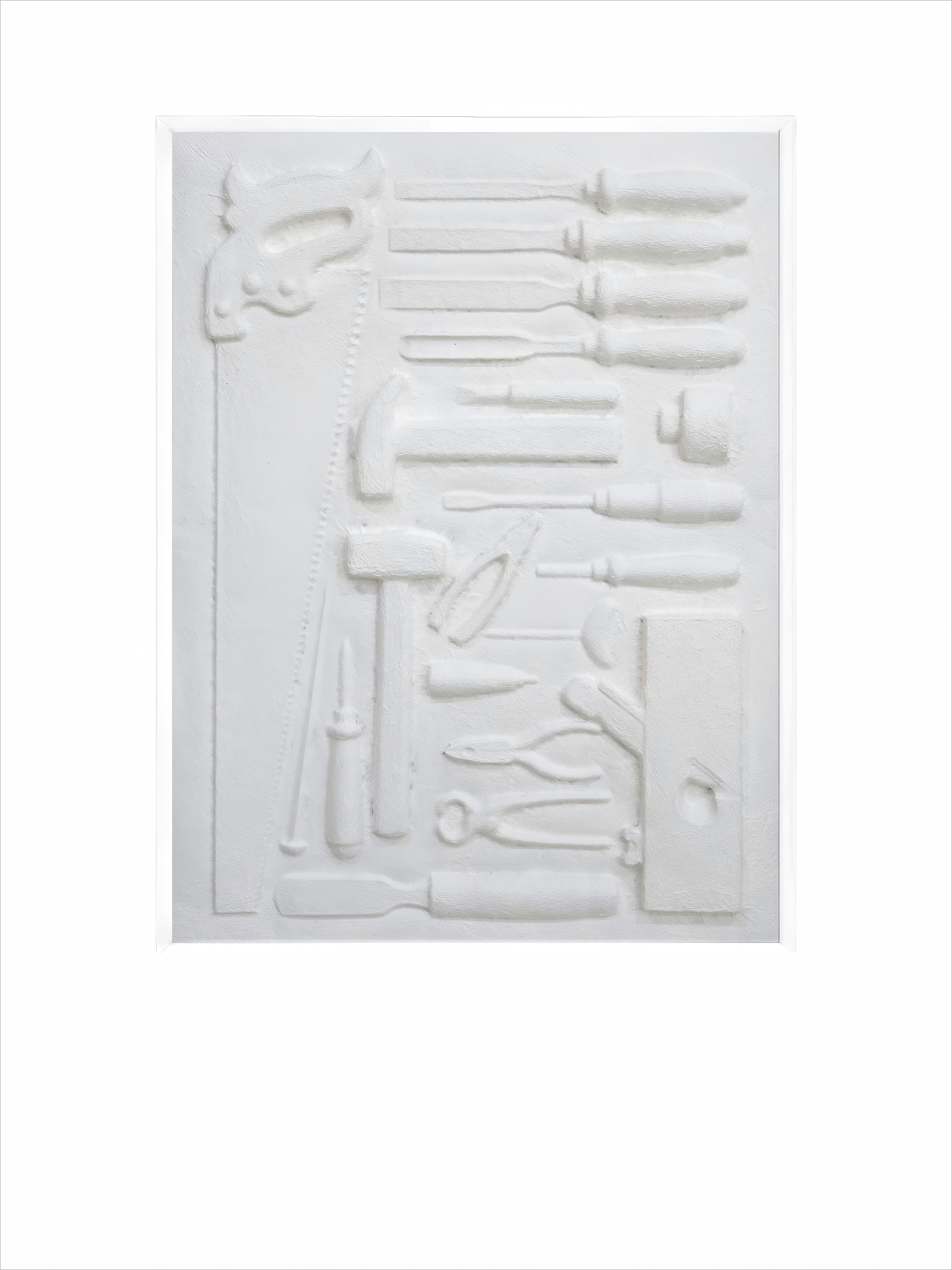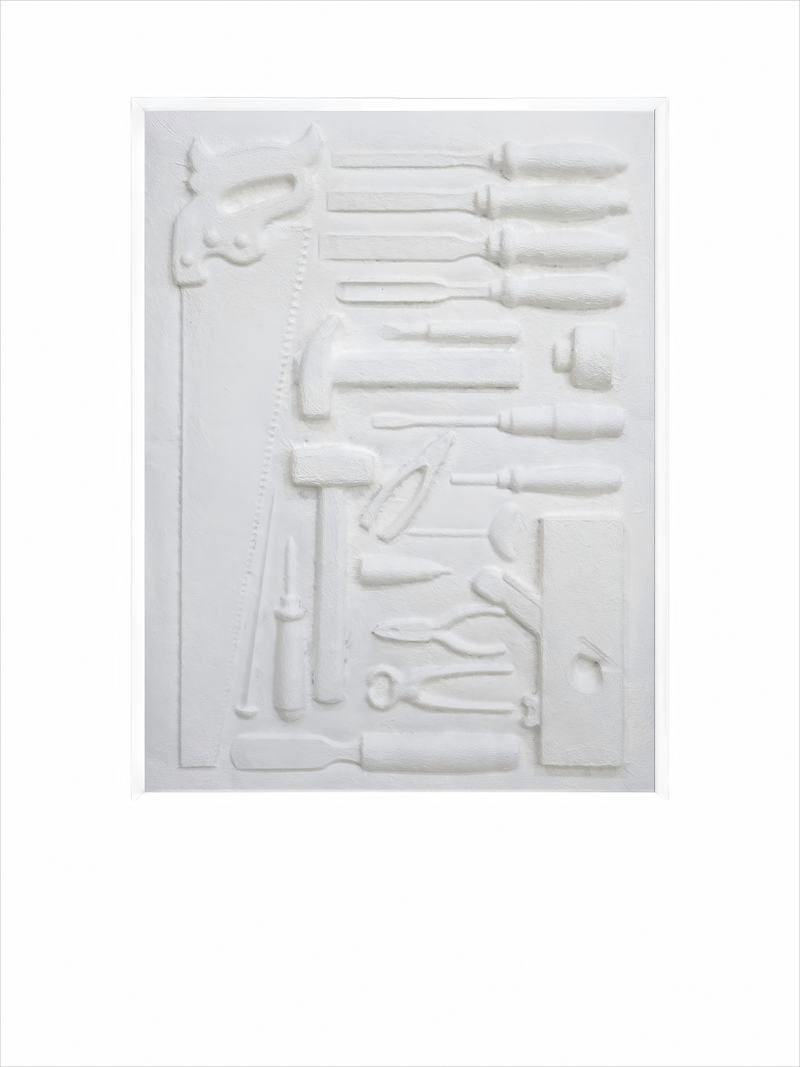Instrument for celebrating the beauty and art of craftsmanship, this Textured Tool Composition Wall Art becomes a beautiful commemoration to the tools of creation and utility. Sizes include 30''x 40''(75 x 100 cm)- a special dimension where this artwork uniquely presents an art texturing in white-on-white composition from various hand tools all handmade by paper pulp. This subtle relief design represents a strong yet subtle visual, perfect for adding a contemporary and artistic dimension to any given space.